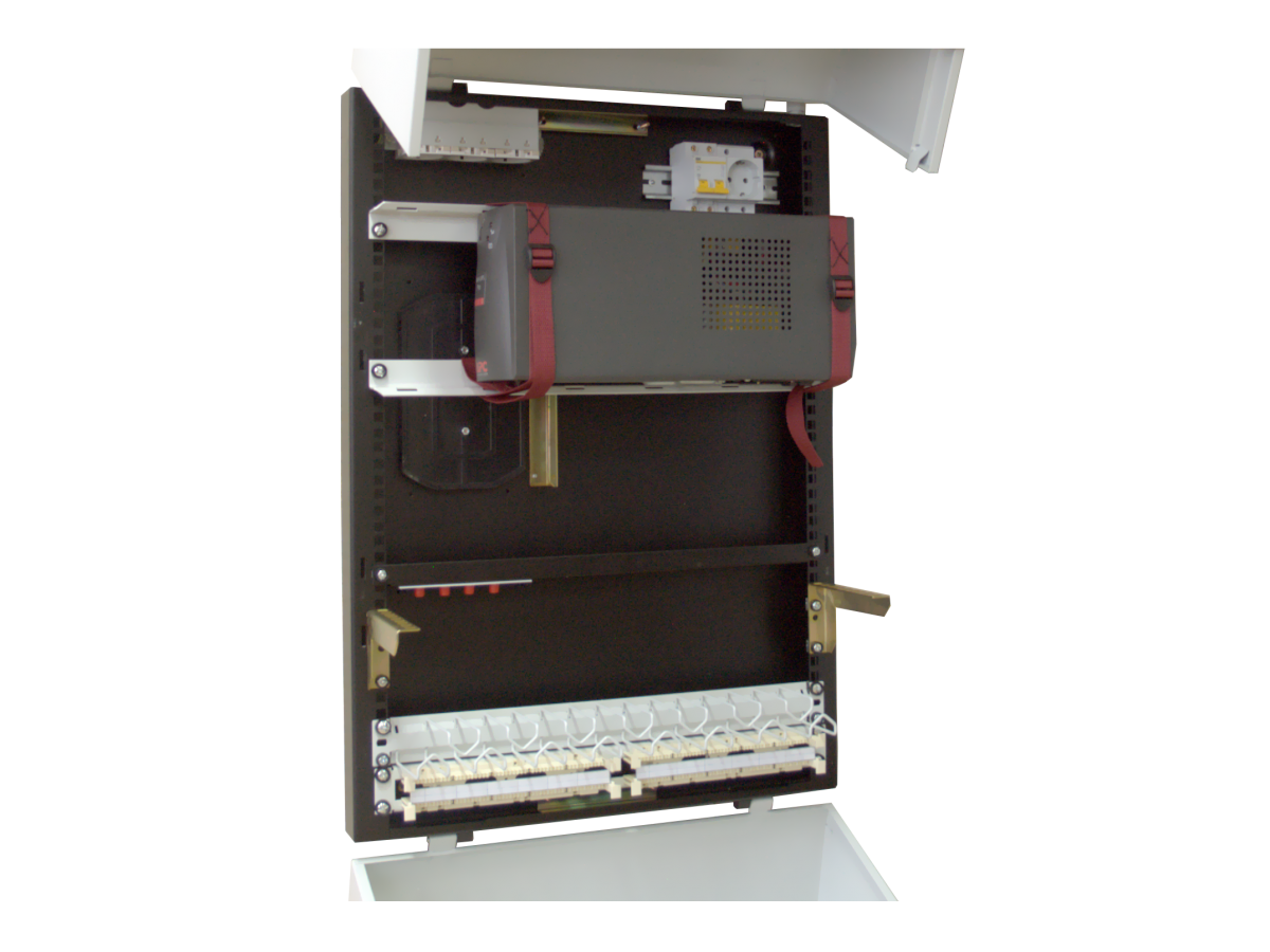 Комплект состоит из двух металлических 19" планок, закрепляемых на основании шкафа, и двух затягиваемых матерчатых лент.