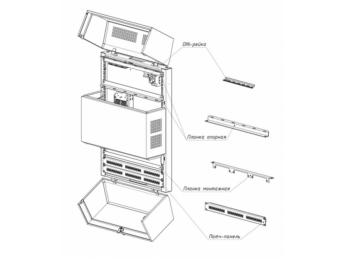Основа конструкции шкафа - настенное основание, выполненное в 19" формате, глубиной 50 мм, позволяет смонтировать стандартное 19" оборудование - кроссы 110 типа, кроссы для плинтов телефонных, кабельные организаторы. Предусмотрены выделенные места в верхней части основания (при вертикальном размещении) для установки до 2-х блоков розеток (по 3 евророзетки), предустановлена DIN-рейка для организации вводной группы питания (автоматы, розетки, счетчик э/э и т.д.). Средняя часть основания имеет штатные места для установки оптической сплайс-кассеты и разделительный кабель-канал для организации потоков кабеля и крепления. Проходные кабельные вводы (снизу и сверху) 30 х 110 мм снабжены прижимными планками для фиксации кабельных жгутов. Отдельные кабельные вводы в углах основания предназначены для ввода кабеля питания.