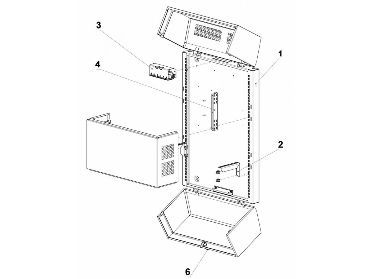 Внешняя оболочка шкафа состоит из 2-х откидных крышек (верхней и нижней) и центрального съемного кожуха. Верхняя крышка и центральный кожух имеют вентиляционные отверстия для отвода тепла. Фиксация верхней крышки происходит при запирании нижней крышки.