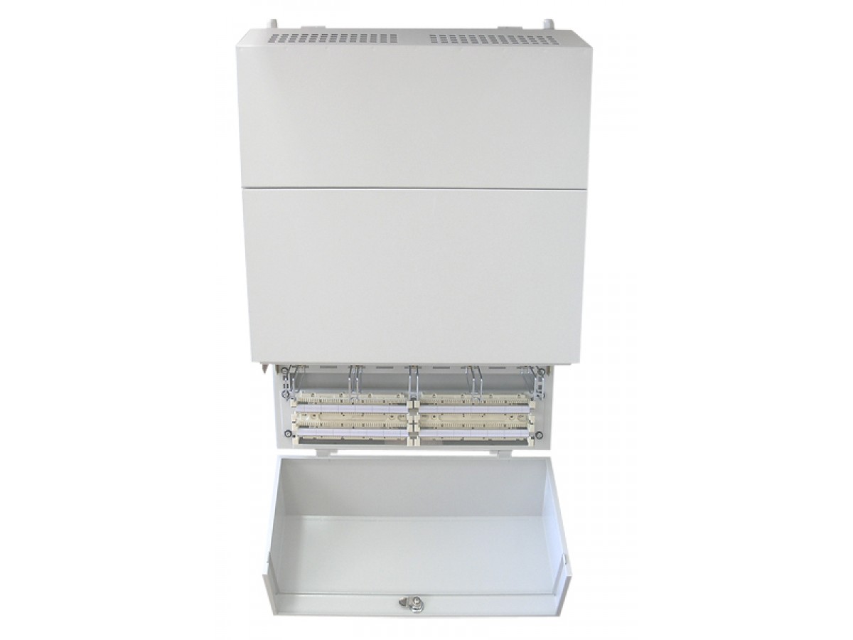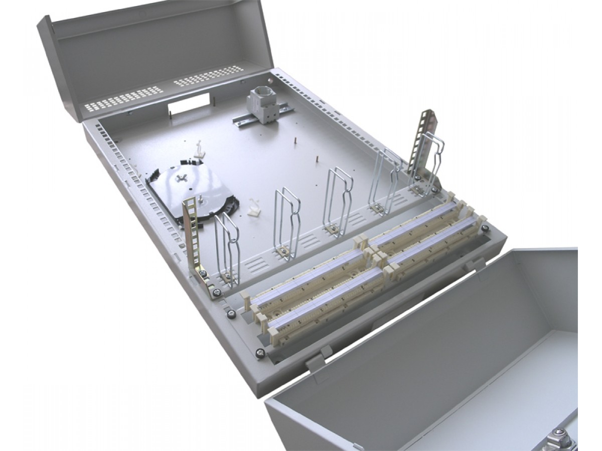Основа конструкции шкафа - настенное основание, выполненное в 19" формате, глубиной 50 мм, позволяет смонтировать стандартное 19" оборудование - кроссы 110 типа, кроссы для плинтов телефонных, кабельные организаторы. Предусмотрены выделенные места в верхней части основания (при вертикальном размещении) для установки до 2-х блоков розеток (по 3 евророзетки), предустановлена DIN-рейка для организации вводной группы питания (автоматы, розетки, счетчик э/э и т.д.). Средняя часть основания имеет штатные места для установки оптической сплайс-кассеты и разделительный кабель-канал для организации потоков кабеля и крепления. Проходные кабельные вводы (снизу и сверху) 30 х 110 мм снабжены прижимными планками для фиксации кабельных жгутов. Отдельные кабельные вводы в углах основания предназначены для ввода кабеля питания.