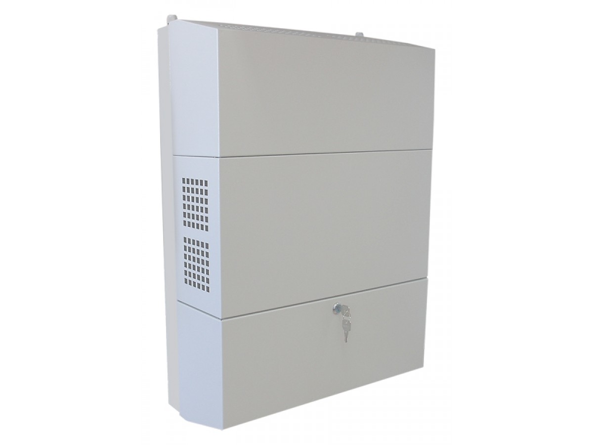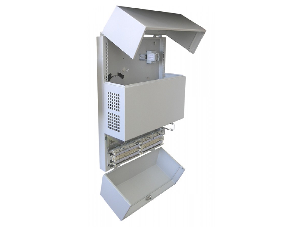 Внешняя оболочка шкафа состоит из 2-х откидных крышек (верхней и нижней) и центрального съемного кожуха. Верхняя крышка и центральный кожух имеют вентиляционные отверстия для отвода тепла. Фиксация верхней крышки происходит при запирании нижней крышки.