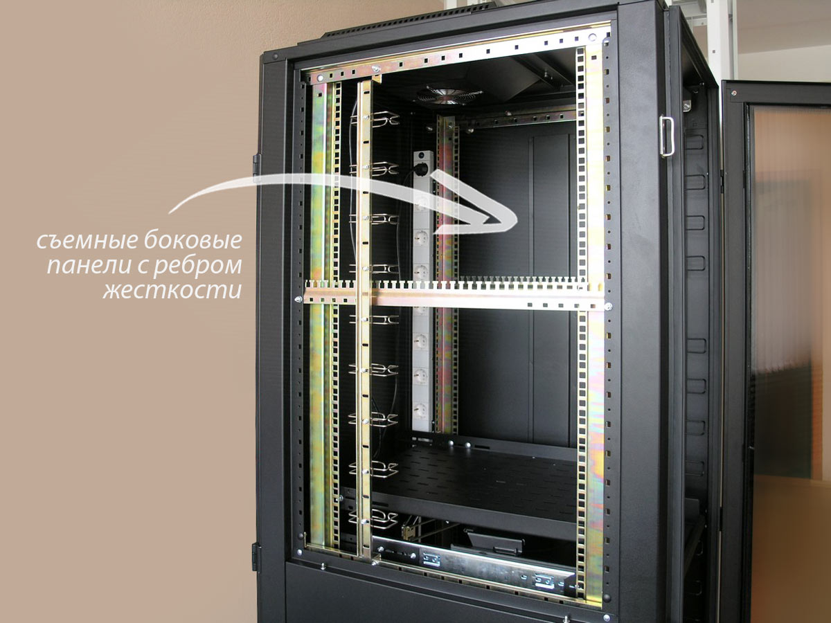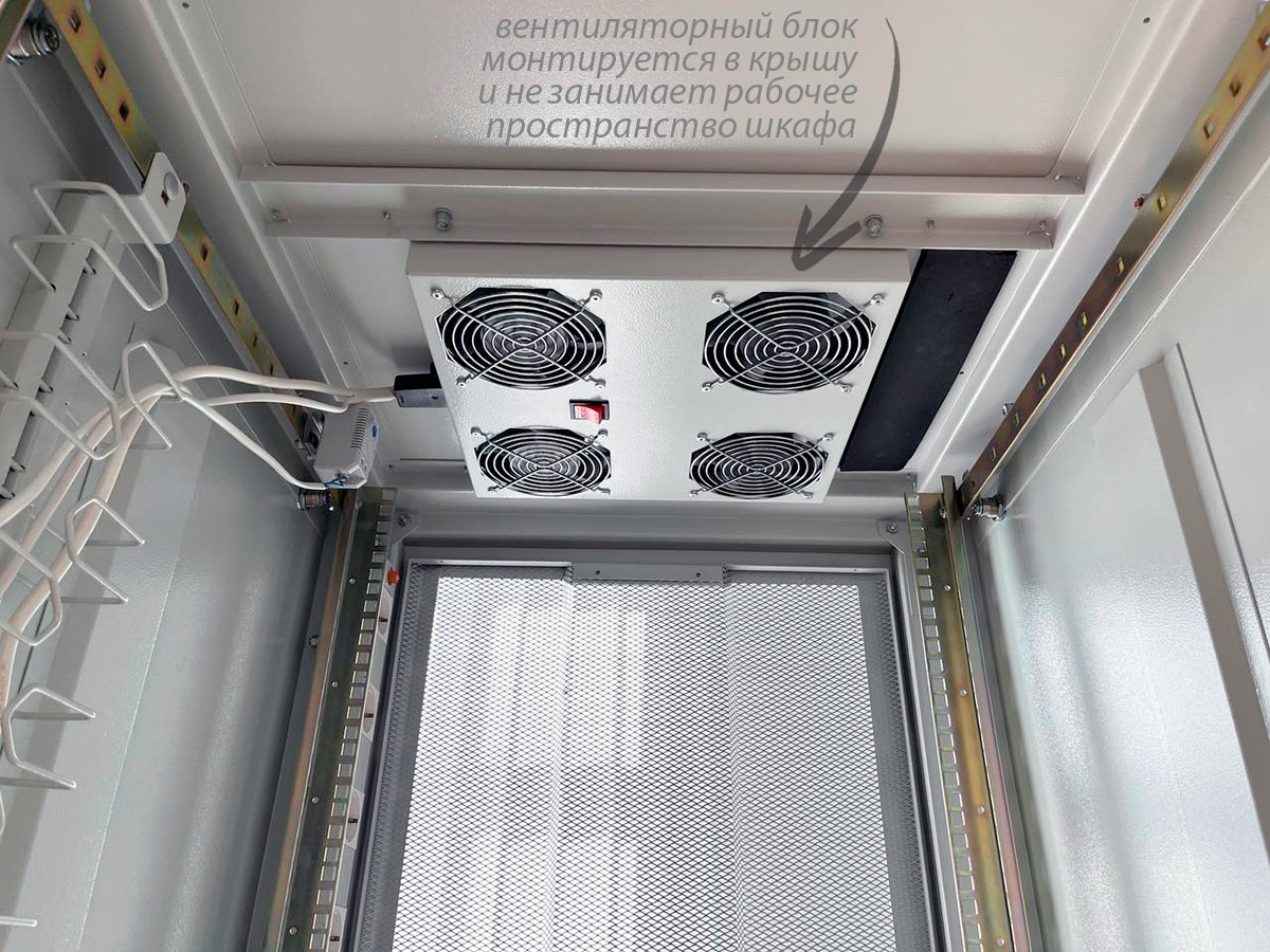 Для эффективного охлаждения размещенного оборудования предусмотрена установка вентиляторов в специальных местах, расположенных в крыше шкафа. Такая система позволяет поддерживать оптимальный микроклимат внутри напольного шкафа, предотвращая перегрев техники и повышая её надёжность и срок службы.