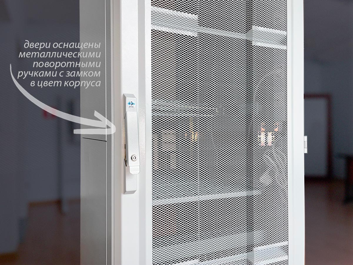Телекоммуникационный шкаф со стеклянными передними дверцами и металлическими задними дверцами. Фронтальная стеклянная дверь из закаленного стекла "Бронза" обеспечивает визуальный контроль над оборудованием внутри напольного шкафа. Дверцы легко устанавливаются и крепятся с возможностью выбора направления открывания — слева или справа, существенно расширяя возможности адаптации телекоммуникационного шкафа к различным условиям эксплуатации.